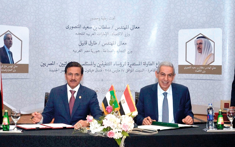 وعلى هامش انعقاد أعمال اللجنة الاقتصادية المشتركة، نظم مجلس الإمارات للمستثمرين بالخارج بالتعاون مع اتحاد الغرف التجارية المصرية اجتماع طاولة مستديرة للرؤساء التنفيذيين والمستثمرين الإماراتيين-المصريين، بحضور معالي المهندس سلطان بن سعيد المنصوري وزير الاقتصاد ومعالي المهندس طارق قابيل وزير التجارة والصناعة المصري. وشهد الاجتماع مناقشات موسعة حول سبل تعزيز بيئة الأعمال ومناخ الاستثمار أمام المستثمرين وتطلعات الشركات في أسواق البلدين للتعاون في المرحلة المقبلة، وأيضا أبرز التحديات الراهنة والحلول المقترحة، المشاريع الجديدة الجاري دراستها، المزايا النسبية التي يتمتع بها أسواق البلدين، وشارك في أعمال الاجتماع شركات ومستثمرون إماراتيون ومصريون في قطاعات الاتصالات وتكنولوجيا المعلومات والطاقة وإدارة المشاريع الاستثمارية، مشاريع الإنتاج الزراعي، قطاع التجزئة، التعدين، السوق المصرفي والصيرفة الإسلامية، الصناعات الدوائية، خدمات البترول والوقود.
