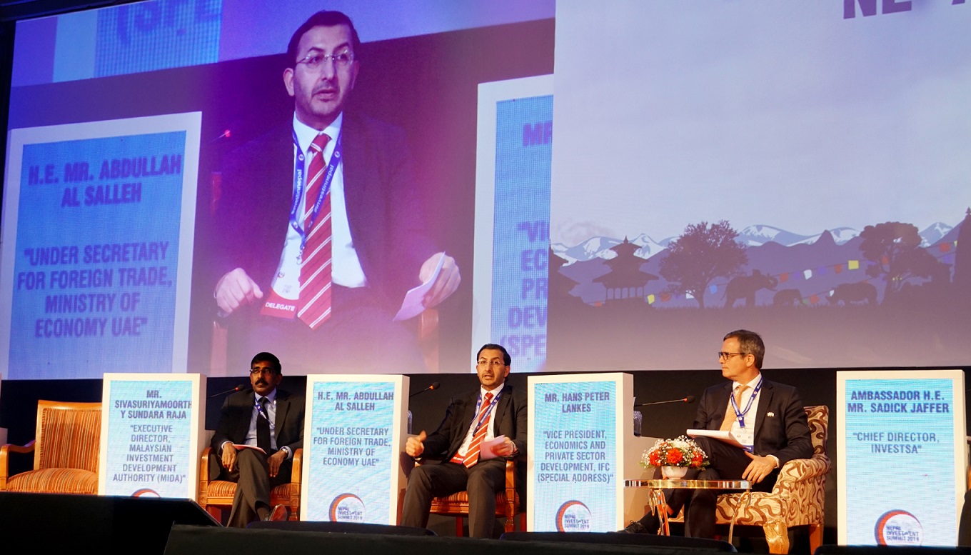وقد شارك سعادة عبد الله آل صالح كمتحدث في جلسة "مشاركة الخبرات الدولية" في قمة نيبال للاستثمار، حيث استعرض سعادته جوانب من تجربة دولة الإمارات في تحفيز تدفقات الاستثمار الأجنبي المباشر، مثنياً على جهود الحكومة النيبالية لتهيئة بيئة ملائمة للمستثمرين، مؤكداً أهمية قمة نيبال للاستثمار كمنصة لاستقطاب الاستثمارات الدولية والتعريف بالفرص الاستثمارية في الأسواق النيبالية.