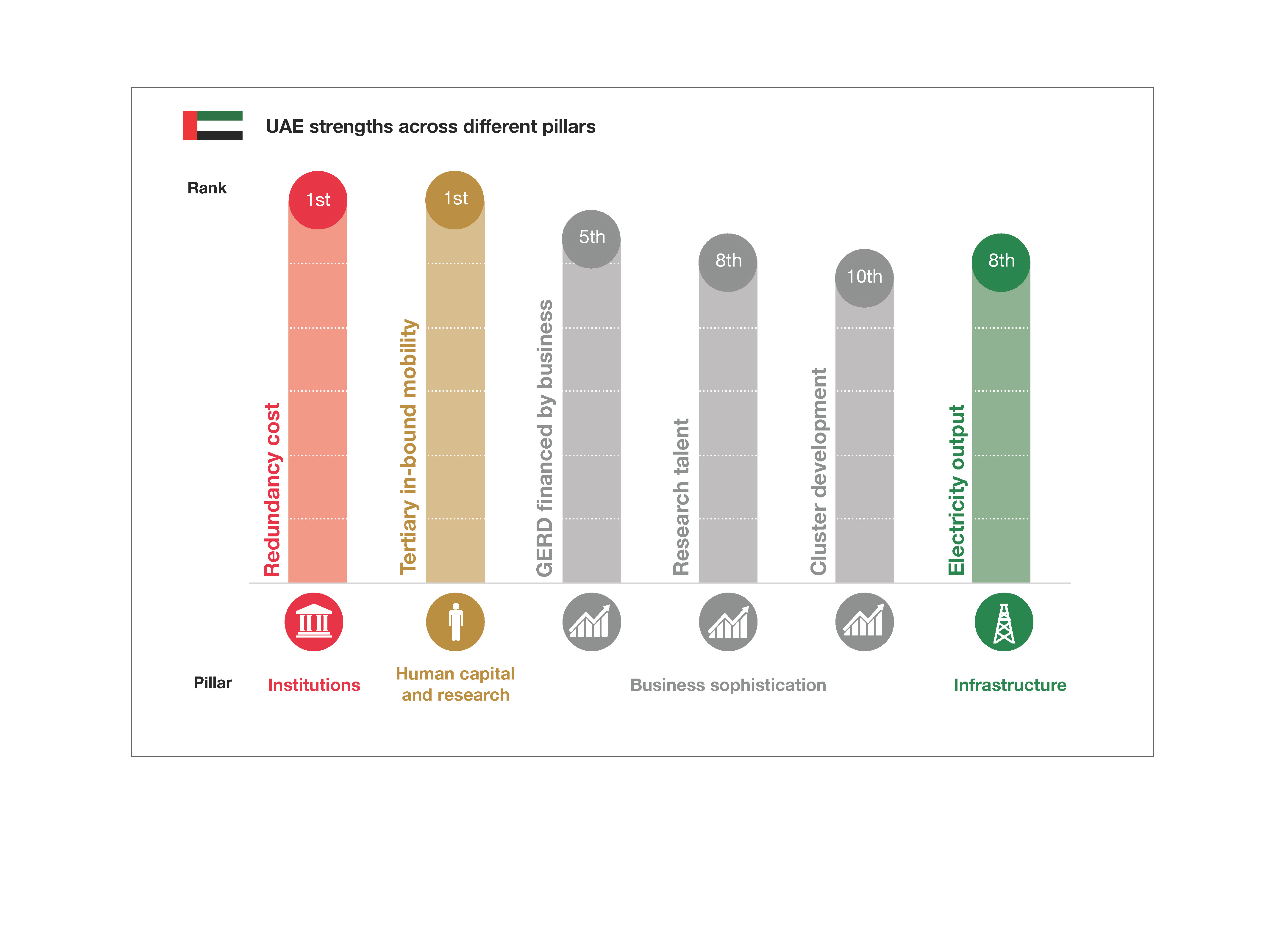 تقدم الإمارات على محاور رأس المال البشري والبحوث، والبنية التحتية، والمخرجات الإبداعية، والمؤسسات