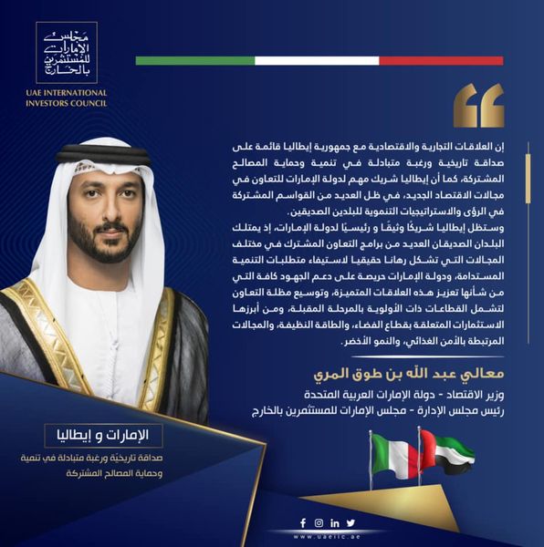 إن العلاقات التجارية والاقتصادية مع جمهورية إيطاليا قائمة على صداقة تاريخية ورغبة متبادلة في تنمية وحماية المصالح المشتركة، كما أن إيطاليا شريك مهم لدولة الإمارات للتعاون في مجالات الاقتصاد الجديد، في ظل العديد من القواسم المشتركة في الرؤى والاستراتيجيات التنموية للبلدين الصديقين.