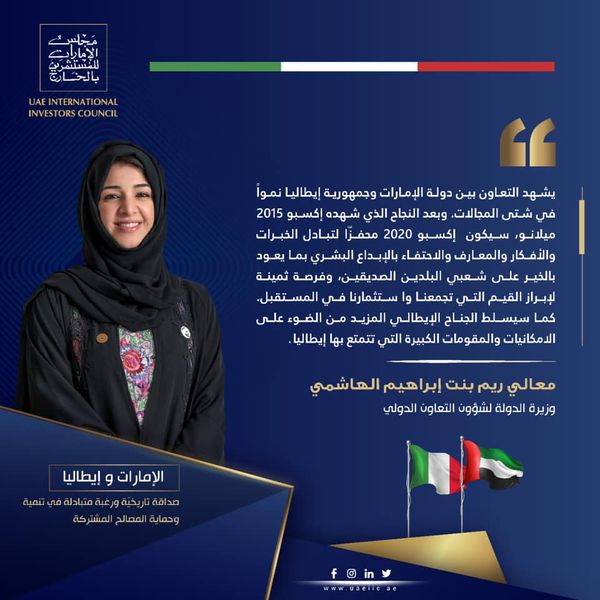 يشهد التعاون بين دولة الإمارات وجمهورية إيطاليا نمواً في شتى المجالات. وبعد النجاح الذي شهده إكسبو 2015 ميلانو، سيكون إكسبو 2020 محفزّا لتبادل الخبرات والأفكار والمعارف والاحتفاء بالإبداع البشري بما يعود بالخير على شعبي البلدين الصديقين، وفرصة ثمينة لإبراز القيم التي تجمعنا وا ستثمارنا في المستقبل. كما سيسلط الجناح الإيطالي المزيد من الضوء على الامكانيات والمقومات الكبيرة التي تتمتع بها إيطاليا.