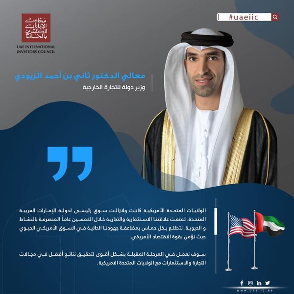 الولايات المتحدة الأمريكية كانت ولازالت سوق رئيسي لدولة الإمارات العربية المتحدة. تمتعت علاقتنا الاستثمارية والتجارية خلال الخمسين عاماً المنصرمة بالنشاط و الحيوية. نتطلع بكل حماس بمضاعفة جهودنا الحالية في السوق الأمريكي الحيوي حيث نؤمن بقوة الاقتصاد الأمريكي.