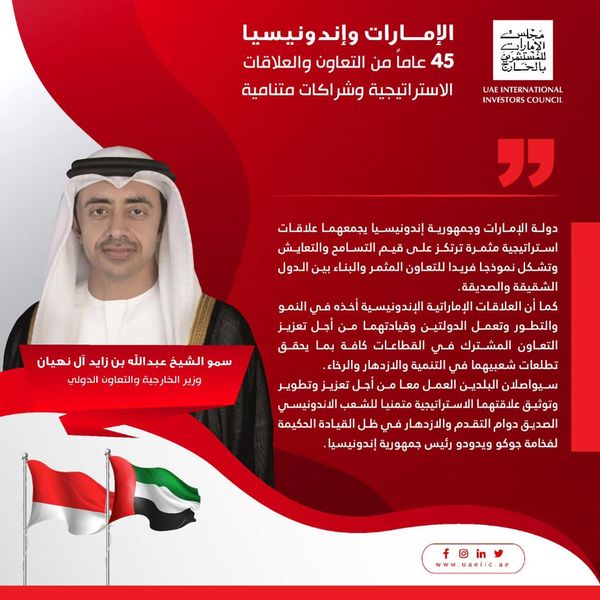 كما أن العلاقات الإماراتية الإندونيسية أخذه في النمو والتطور وتعمل الدولتين وقيادتهما من أجل تعزيز التعاون المشترك في القطاعات كافة بما يحقق تطلعات شعبيهما في التنمية والازدهار والرخاء.