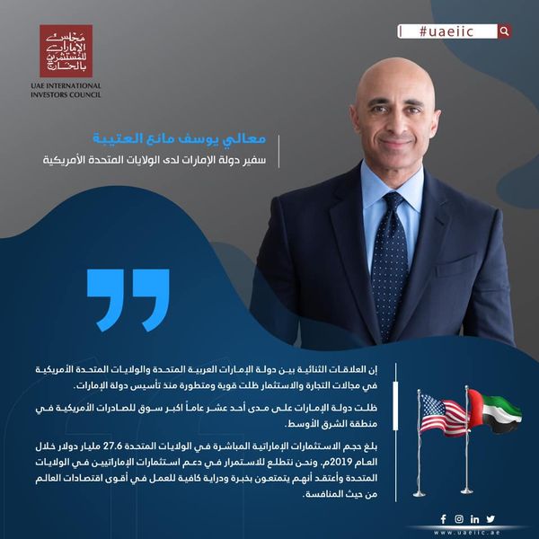 بلغ حجم الاستثمارات الإماراتية المباشرة في الولايات المتحدة 27.6 مليار دولار خلال العام 2019م. ونحن نتطلع للاستمرار في دعم استثمارات الإماراتيين في الولايات المتحدة وأعتقد أنهم يتمتعون بخبرة ودراية كافية للعمل في أقوى اقتصادات العالم من حيث المنافسة.