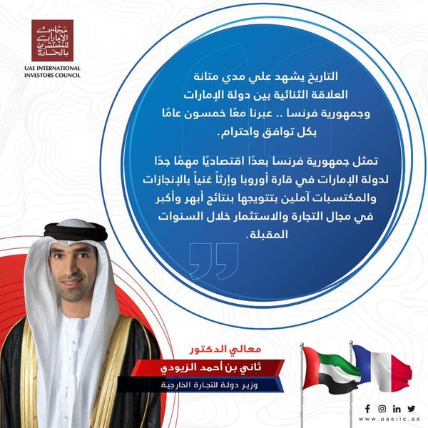تمثل جمهورية فرنسا بعدًا اقتصاديًا مهمًا جدًا لدولة الإمارات في قارة أوروبا وإرثاً غنياً بالإنجازات والمكتسبات آملين بتتويجها بنتائج أبهر وأكبر في مجال التجارة والاستثمار خلال السنوات المقبلة.