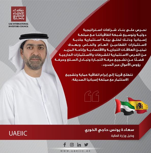 نحرص على بناء شراكات استراتيجية دولية وتوسيع شبكة اتفاقياتنا مع مملكة إسبانيا وذلك لخلق بيئة استثمارية جاذبة لاستثمارات القطاعين العام والخاص وبهدف تمتين العلاقات التجارية والاقتصادية وإتاحة المزيد من الفرص الاستثمارية للشركات والاستثمارات الخارجية فضلًا عن تشجيع حركة التجارة وتبادل السلع وحركة رؤوس الأموال عبر الحدود.