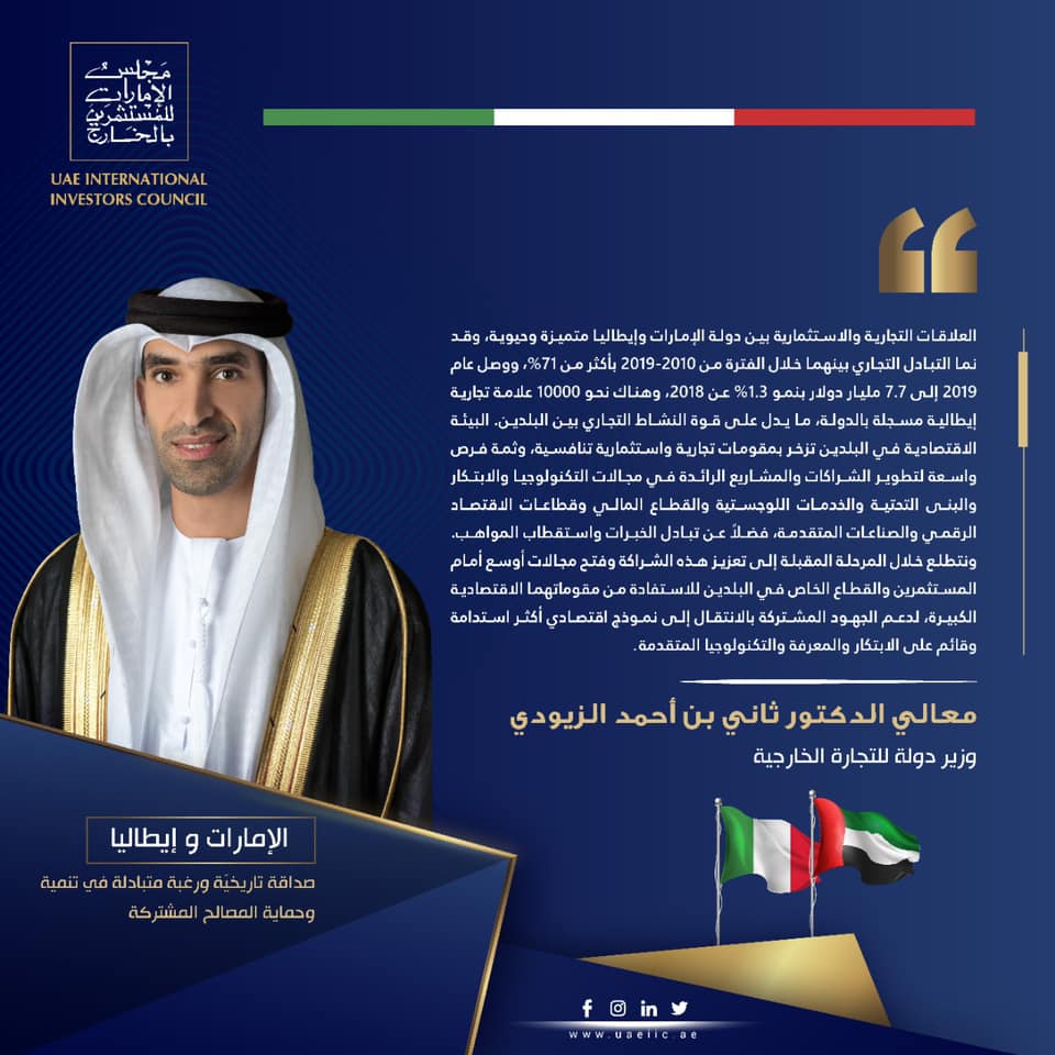 العلاقات التجارية والاستثمارية بين دولة الإمارات وإيطاليا متميزة وحيوية، وقد نما التبادل التجاري بينهما خلال الفترة من 2010-2019 بأكثر من 71%، ووصل عام 2019 إلى 7.7 مليار دولار بنمو 1.3% عن 2018، وهناك نحو 10000 علامة تجارية إيطالية مسجلة بالدولة، ما يدل على قوة النشاط التجاري بين البلدين. البيئة الاقتصادية في البلدين تزخر بمقومات تجارية واستثمارية تنافسية، وثمة فرص واسعة لتطوير الشراكات والمشاريع الرائدة في مجالات التكنولوجيا والابتكار والبنى التحتية والخدمات اللوجستية والقطاع المالي وقطاعات الاقتصاد الرقمي والصناعات المتقدمة، فضلاً عن تبادل الخبرات واستقطاب المواهب. ونتطلع خلال المرحلة المقبلة إلى تعزيز هذه الشراكة وفتح مجالات أوسع أمام المستثمرين والقطاع الخاص في البلدين للاستفادة من مقوماتهما الاقتصادية الكبيرة، لدعم الجهود المشتركة بالانتقال إلى نموذج اقتصادي أكثر استدامة وقائم على الابتكار والمعرفة والتكنولوجيا المتقدمة.