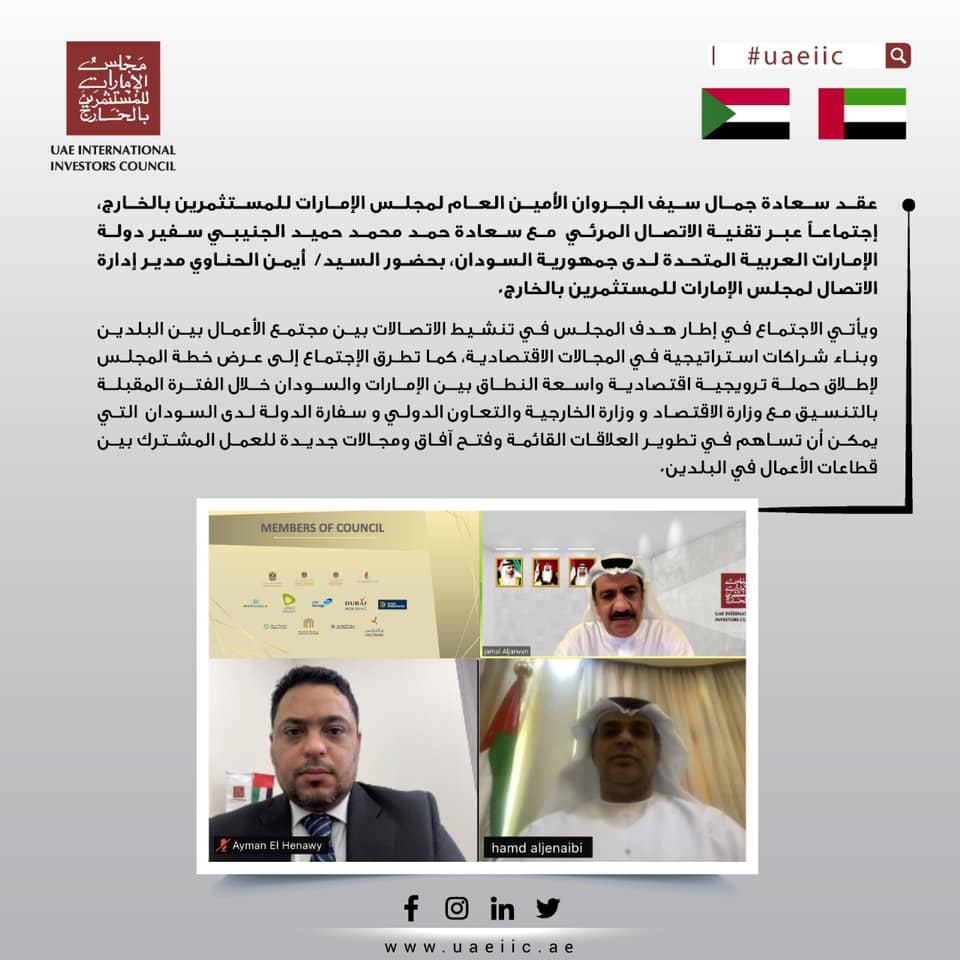 عقد سعادة جمال سيف الجروان الأمين العام لمجلس الإمارات للمستثمرين بالخارج، إجتماعاً عبر تقنية الاتصال المرئي مع سعادة حمد محمد حميد الجنيبي سفير دولة الإمارات العربية المتحدة لدى جمهورية السودان، بحضور السيد/ أيمن الحناوي مدير إدارة الاتصال لمجلس الإمارات للمستثمرين بالخارج.