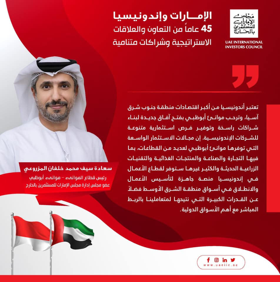تعتبر أندونيسيا من أكبر اقتصادات منطقة جنوب شرق آسيا، وترحب موانئ أبوظبي بفتح آفاق جديدة لبناء شراكات راسخة وتوفير فرص استثمارية متنوعة للشركات الإندونيسية. إن مجالات الاستثمار الواسعة التي توفرها موانئ أبوظبي لعديد من القطاعات، بما فيها التجارة والصناعة والمنتجات الغذائية والتقنيات الزراعية الحديثة والكثير غيرها ستوفر لقطاع الأعمال في إندونيسيا منصة جاهزة لتأسيس الأعمال والانطلاق في أسواق منطقة الشرق الأوسط فضلاً عن القدرات الكبيرة التي نتيحها لمتعاملينا بالربط المباشر مع أهم الأسواق الدولية.