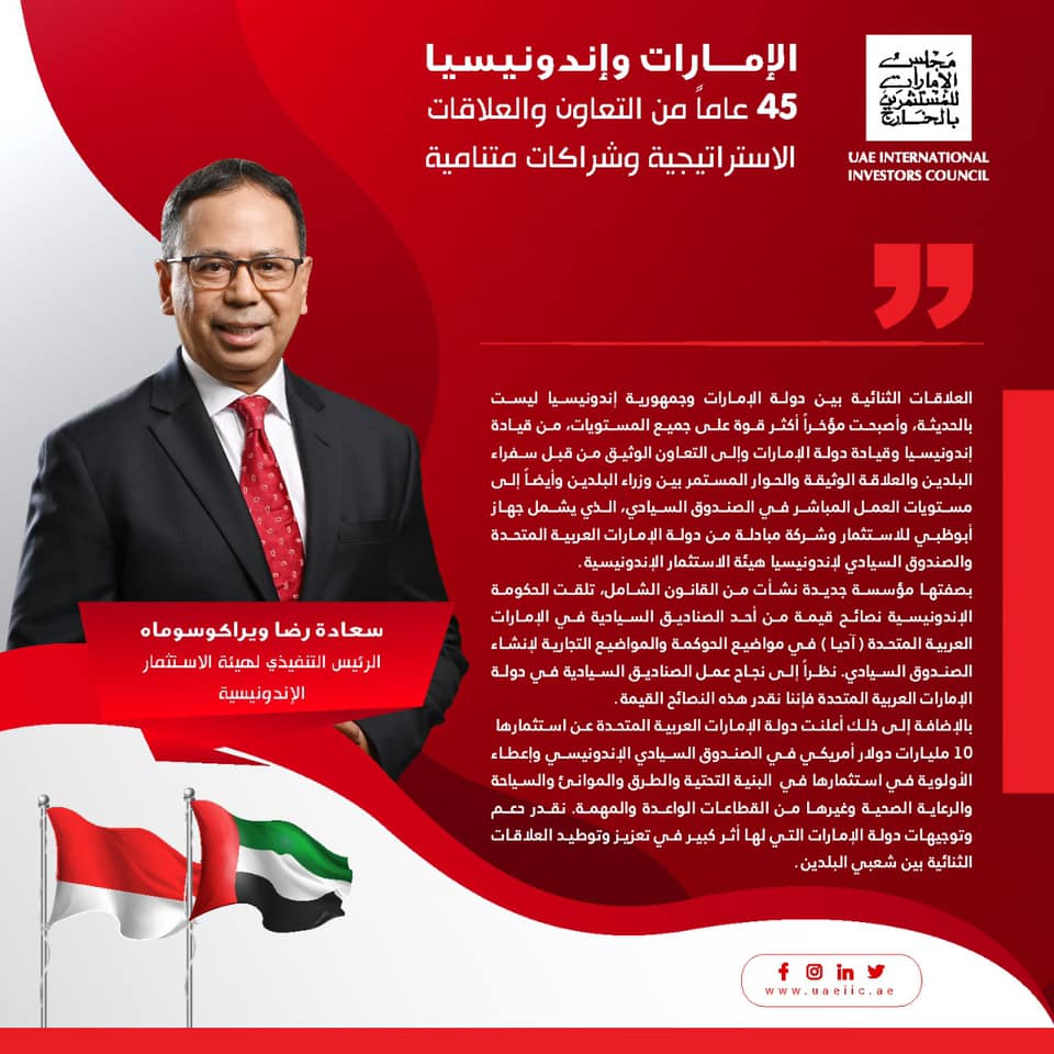 العلاقات الثنائية بين دولة الإمارات وجمهورية إندونيسيا ليست بالحديثة، وأصبحت مؤخراً أكثر قوة على جميع المستويات، من قيادة إندونيسيا وقيادة دولة الإمارات وإلى التعاون الوثيق من قبل سفراء البلدين والعلاقة الوثيقة والحوار المستمر بين وزراء البلدين وأيضاً إلى مستويات العمل المباشر في الصندوق السيادي، الذي يشمل جهاز أبوظبي للاستثمار وشركة مبادلة من دولة الإمارات العربية المتحدة والصندوق السيادي لإندونيسيا هيئة الاستثمار الإندونيسية.
