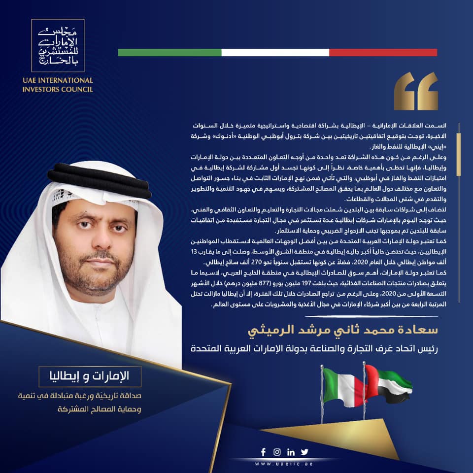 الإمارات و إيطاليا صداقة تاريخيّة ورغبة متبادلة في تنمية وحماية المصالح المشتركة