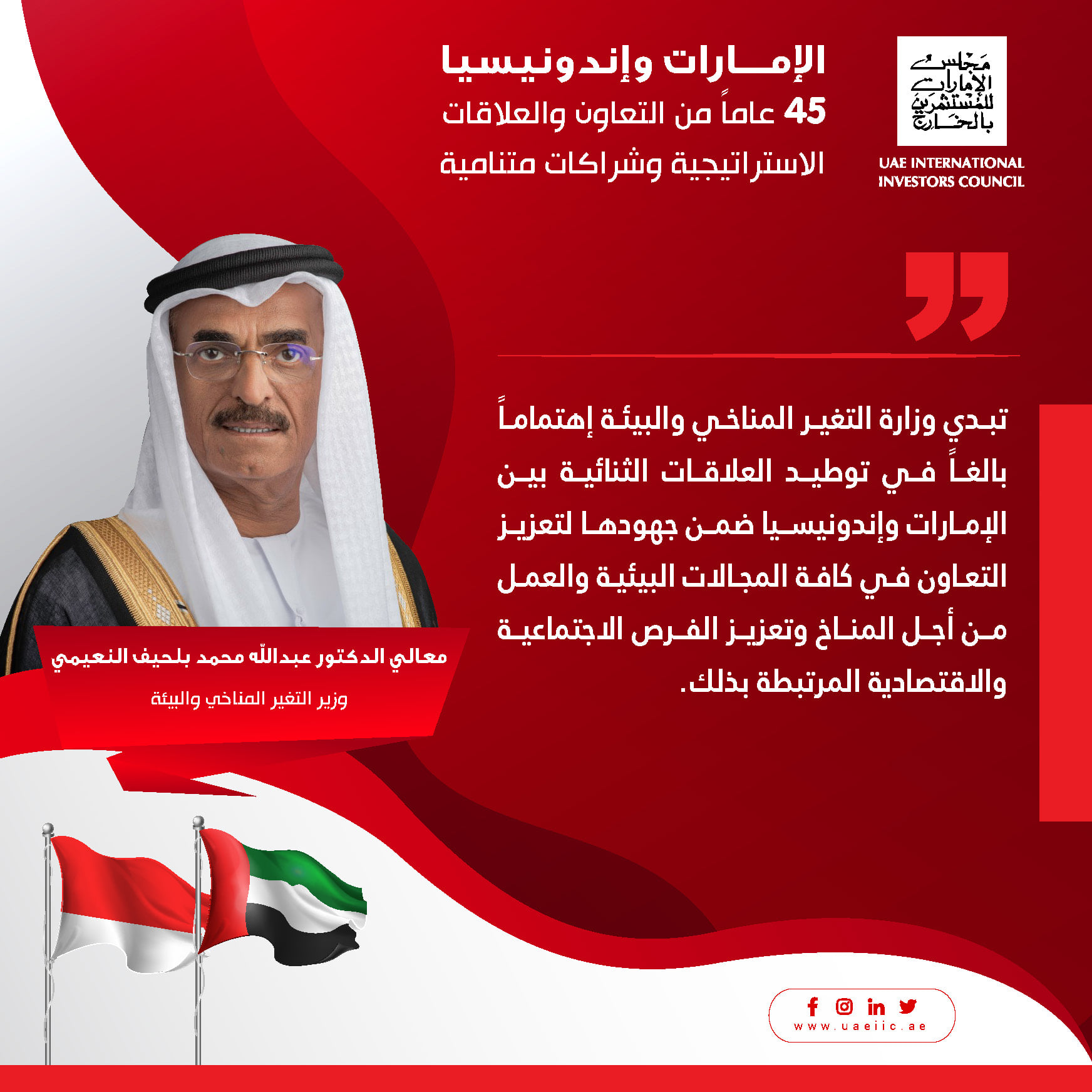تبدي وزارة التغير المناخي والبيئة إهتماماً بالغاً في توطيد العلاقات الثنائية بين الإمارات وإندونيسيا ضمن جهودها لتعزيز التعاون في كافة المجالات البيئية والعمل من أجل المناخ وتعزيز الفرص الاجتماعية والاقتصادية المرتبطة بذلك.
