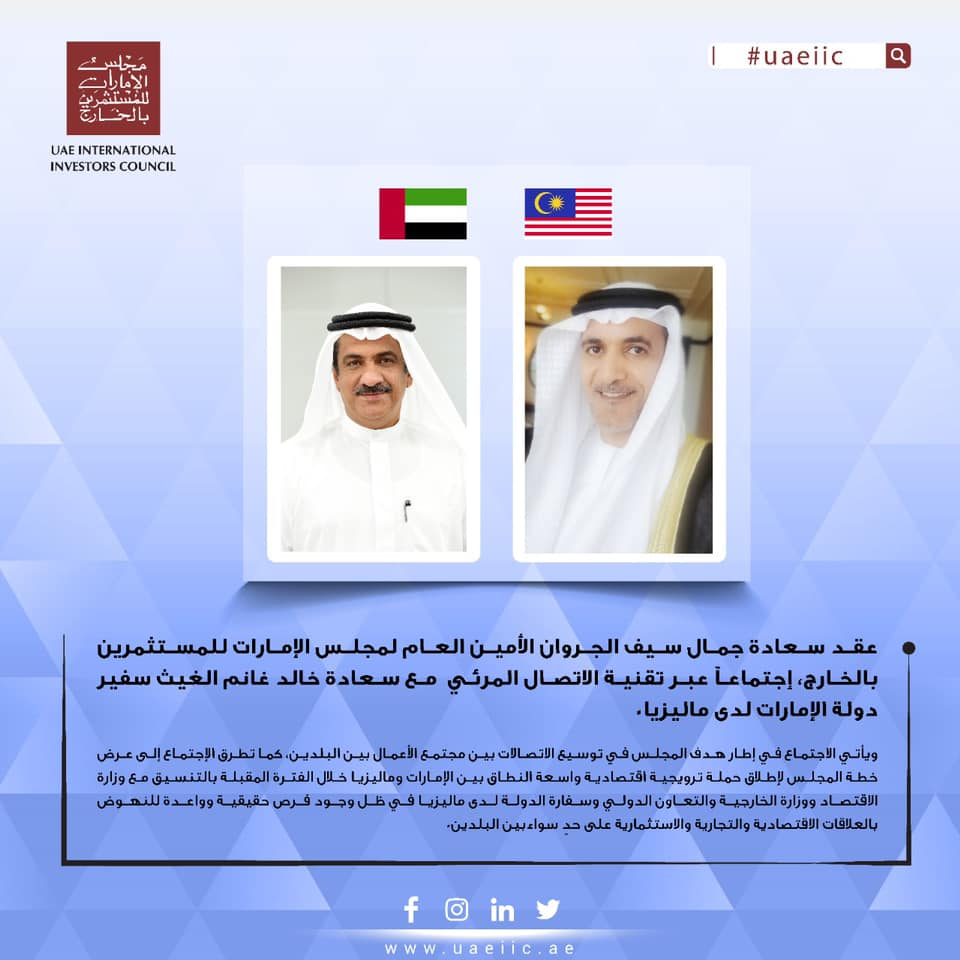 عقد سعادة جمال سيف الجروان الأمين العام لمجلس الإمارات للمستثمرين بالخارج، إجتماعاً عبر تقنية الاتصال المرئي مع سعادة ﺧﺎﻟﺪ ﻏﺎﻧﻢ اﻟﻐﻴﺚ ﺳﻔﻴﺮ دولة الإمارات ﻟﺪى ﻣﺎﻟﻴﺰﻳﺎ.