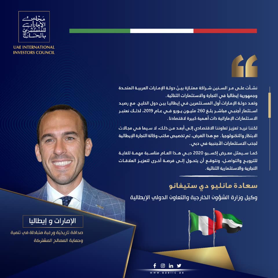 وتعد دولة الإمارات أول المستثمرين في إيطاليا بين دول الخليج. مع رصيد استثمار أجنبي مباشر بلغ 260 مليون يورو في عام 2019، لذلك نعتبر الاستثمارات الإماراتية ذات أهمية كبيرة لاقتصادنا.