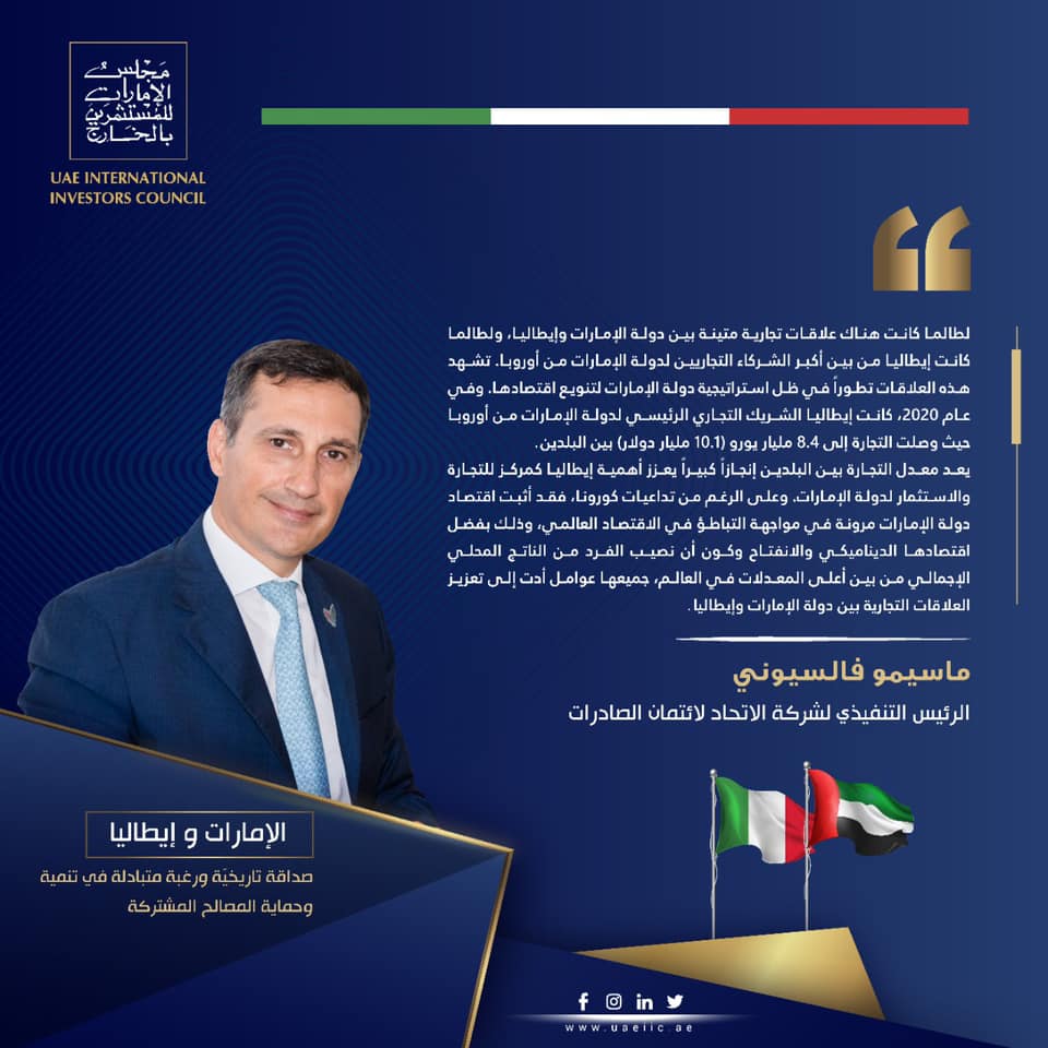 يعد معدل التجارة بين البلدين إنجازاً كبيراً يعزز أهمية إيطاليا كمركز للتجارة والاستثمار لدولة الإمارات. وعلى الرغم من تداعيات كورونا، فقد أثبت اقتصاد دولة الإمارات مرونة في مواجهة التباطؤ في الاقتصاد العالمي، وذلك بفضل اقتصادها الديناميكي والانفتاح وكون أن نصيب الفرد من الناتج المحلي الإجمالي من بين أعلى المعدلات في العالم، جميعها عوامل أدت إلى تعزيز العلاقات التجارية بين دولة الإمارات وإيطاليا.