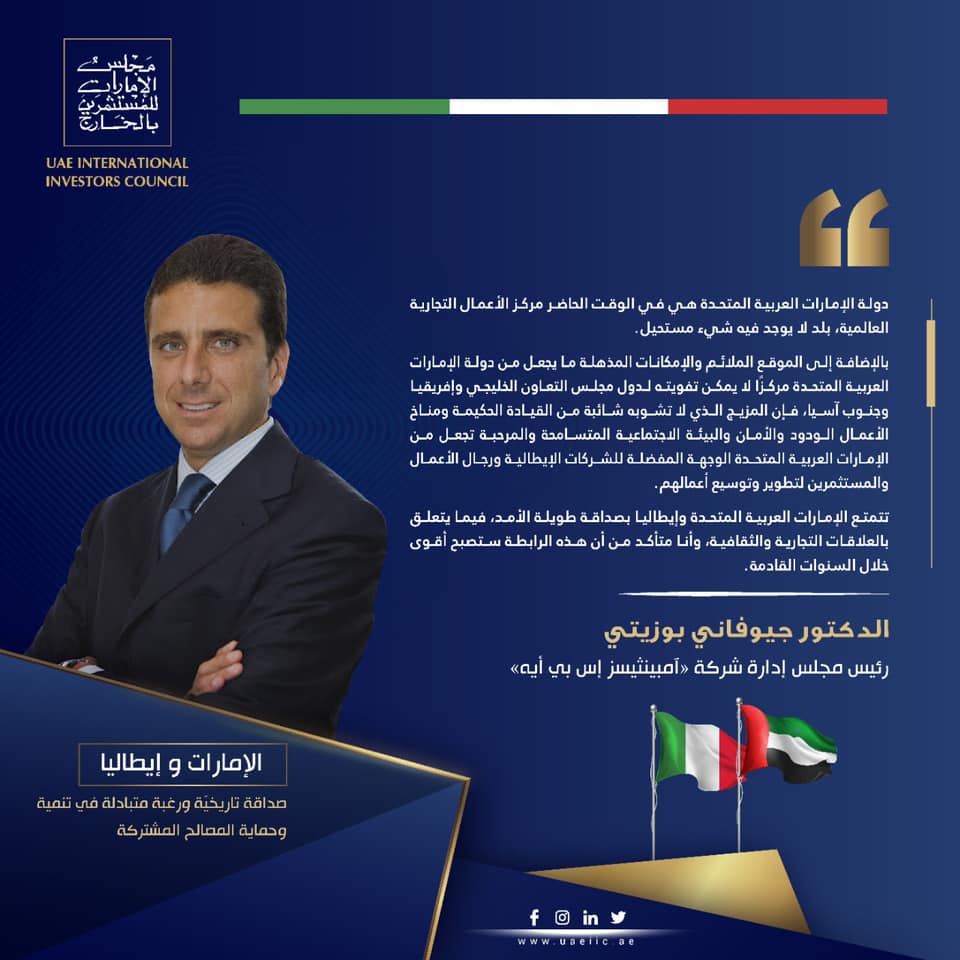 بالإضافة إلى الموقع الملائم والإمكانات المذهلة ما يجعل من دولة الإمارات العربية المتحدة مركزًا لا يمكن تفويته لدول مجلس التعاون الخليجي وإفريقيا وجنوب آسيا، فإن المزيج الذي لا تشوبه شائبة من القيادة الحكيمة ومناخ الأعمال الودود والأمان والبيئة الاجتماعية المتسامحة والمرحبة تجعل من الإمارات العربية المتحدة الوجهة المفضلة للشركات الإيطالية ورجال الأعمال والمستثمرين لتطوير وتوسيع أعمالهم.