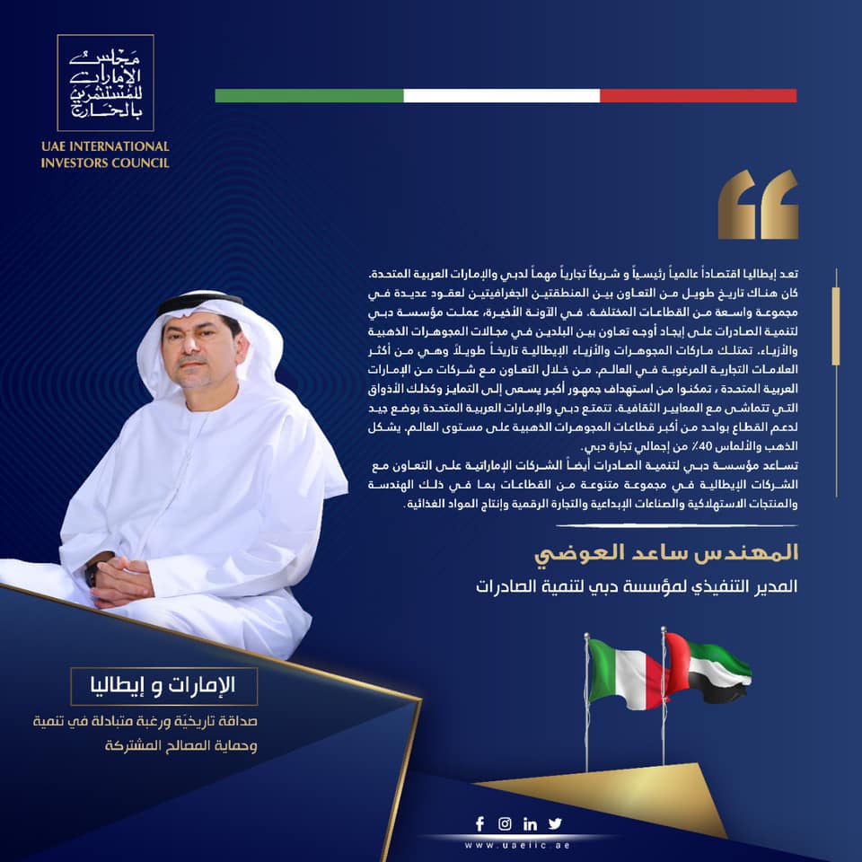 تعد إيطاليا اقتصاداً عالمياً رئيسياً و شريكاً تجارياً مهماً لدبي والإمارات العربية المتحدة. كان هناك تاريخ طويل من التعاون بين المنطقتين الجغرافيتين لعقود عديدة في مجموعة واسعة من القطاعات المختلفة. في الآونة الأخيرة، عملت مؤسسة دبي لتنمية الصادرات على إيجاد أوجه تعاون بين البلدين في مجالات المجوهرات الذهبية والأزياء. تمتلك ماركات المجوهرات والأزياء الإيطالية تاريخاً طويلاً وهي من أكثر العلامات التجارية المرغوبة في العالم. من خلال التعاون مع شركات من الإمارات العربية المتحدة ، تمكنوا من استهداف جمهور أكبر يسعى إلى التمايز وكذلك الأذواق التي تتماشى مع المعايير الثقافية. تتمتع دبي والإمارات العربية المتحدة بوضع جيد لدعم القطاع بواحد من أكبر قطاعات المجوهرات الذهبية على مستوى العالم. يشكل الذهب والألماس 40٪ من إجمالي تجارة دبي.
