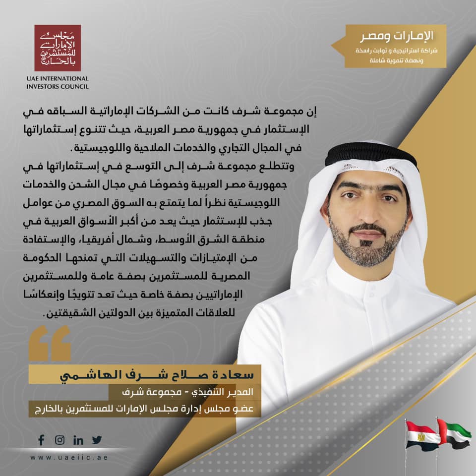 إن مجموعة شرف كانت من الشركات الإماراتية السباقه في الإستثمار في جمهورية مصر العربية، حيث تتنوع إستثماراتها في المجال التجاري والخدمات الملاحية واللوجيستية.