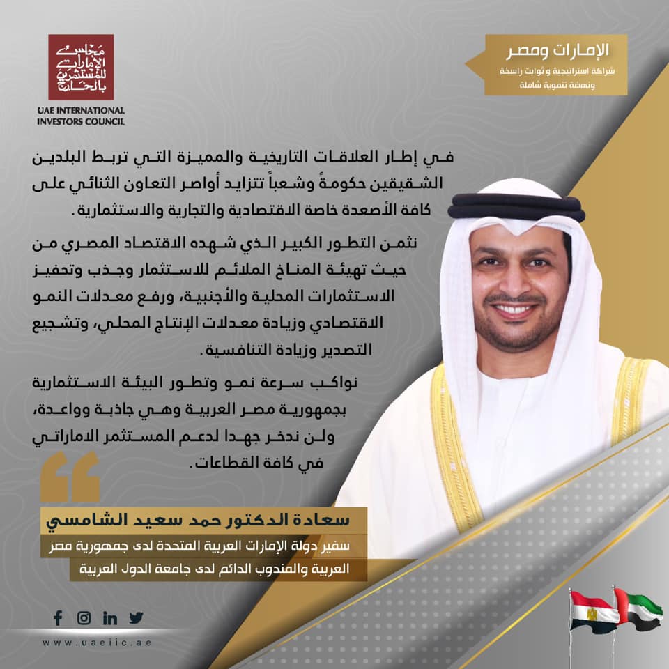 نواكب سرعة نمو وتطور البيئة الاستثمارية بجمهورية مصر العربية وهي جاذبة وواعدة، ولن ندخر جهدا لدعم المستثمر الاماراتي في كافة القطاعات.