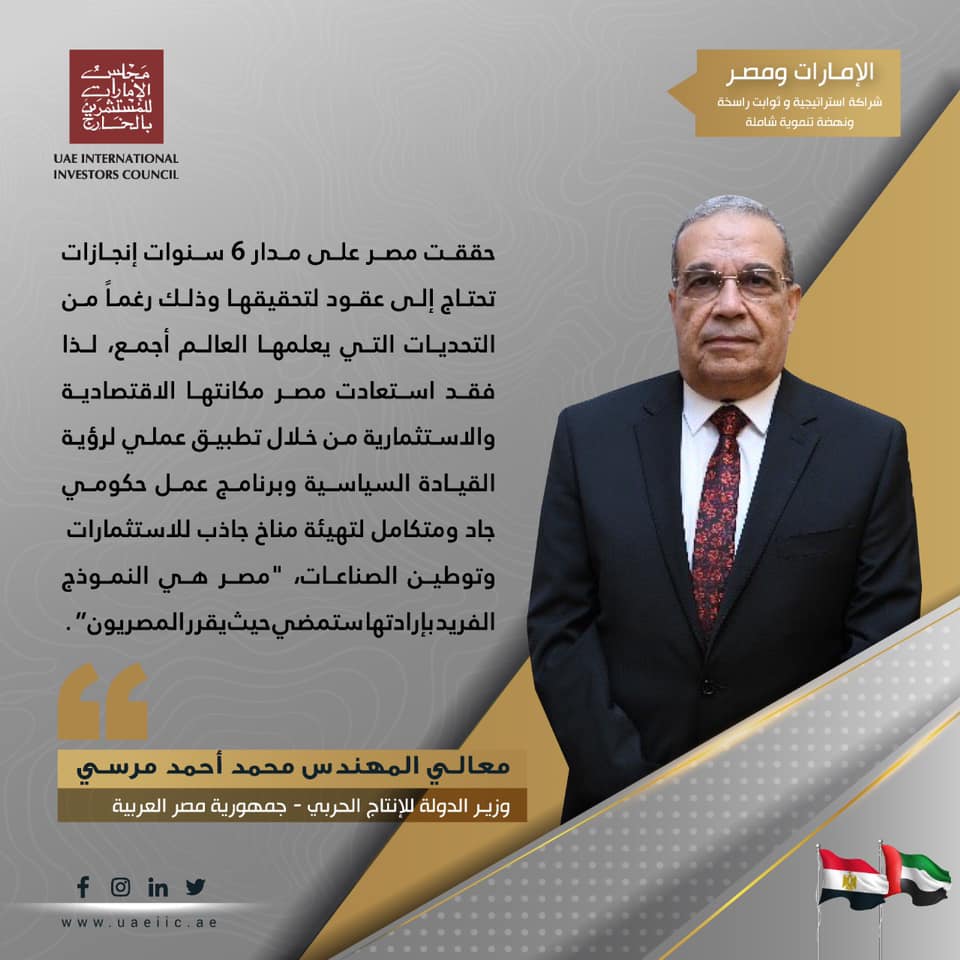 حققت مصر على مدار 6 سنوات إنجازات تحتاج إلى عقود لتحقيقها وذلك رغماً من التحديات التي يعلمها العالم أجمع، لذا فقد استعادت مصر مكانتها الاقتصادية والاستثمارية من خلال تطبيق عملي لرؤية القيادة السياسية وبرنامج عمل حكومي جاد ومتكامل لتهيئة مناخ جاذب للاستثمارات وتوطين الصناعات، "مصر هي النموذج الفريد بإرادتها ستمضي حيث يقرر المصريون“.