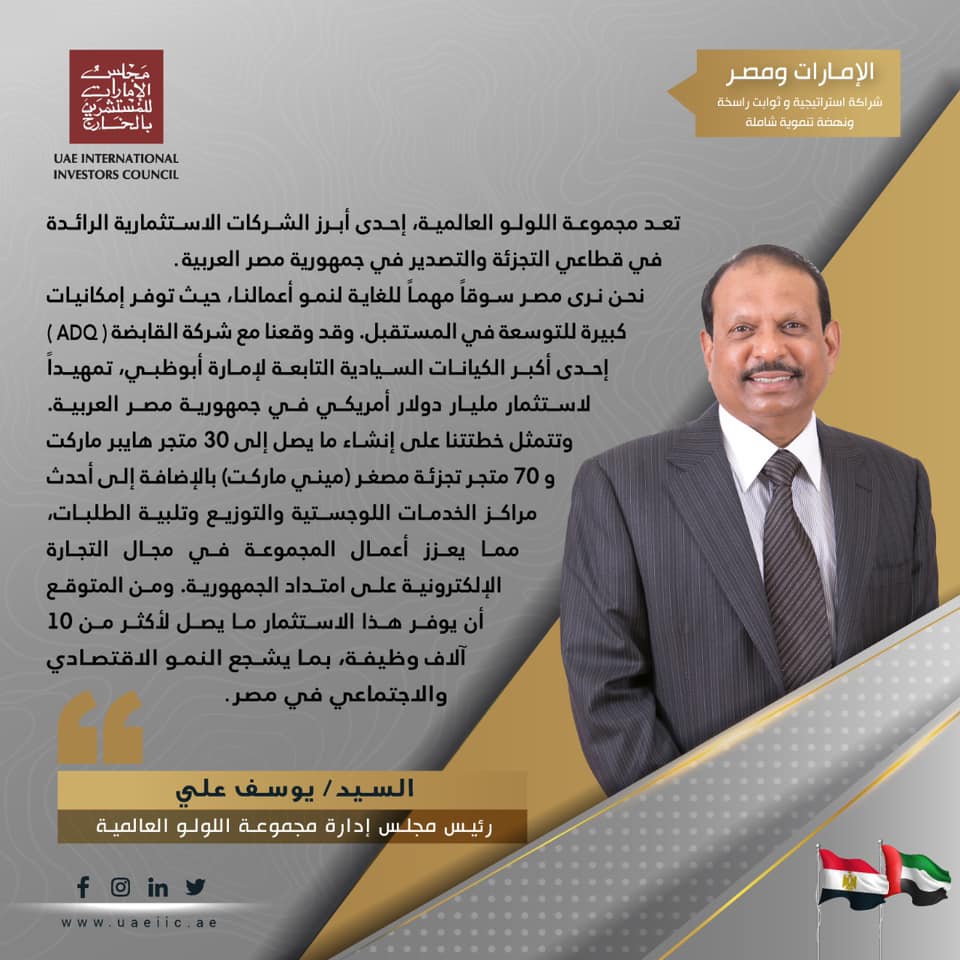 نحن نرى مصر سوقاً مهماً للغاية لنمو أعمالنا، حيث توفر إمكانيات كبيرة للتوسعة في المستقبل. وقد وقعنا مع شركة القابضة ( ADQ ) إحدى أكبر الكيانات السيادية التابعة لإمارة أبوظبي، تمهيداً لاستثمار مليار دولار أمريكي في جمهورية مصر العربية. وتتمثل خطتتنا على إنشاء ما يصل إلى 30 متجر هايبر ماركت و 70متجر تجزئة مصغر (ميني ماركت) بالإضافة إلى أحدث مراكز الخدمات اللوجستية والتوزيع وتلبية الطلبات، مما يعزز أعمال المجموعة في مجال التجارة الإلكترونية على امتداد الجمهورية. ومن المتوقع أن يوفر هذا الاستثمار ما يصل لأكثر من 10 آلاف وظيفة، بما يشجع النمو الاقتصادي والاجتماعي في مصر.