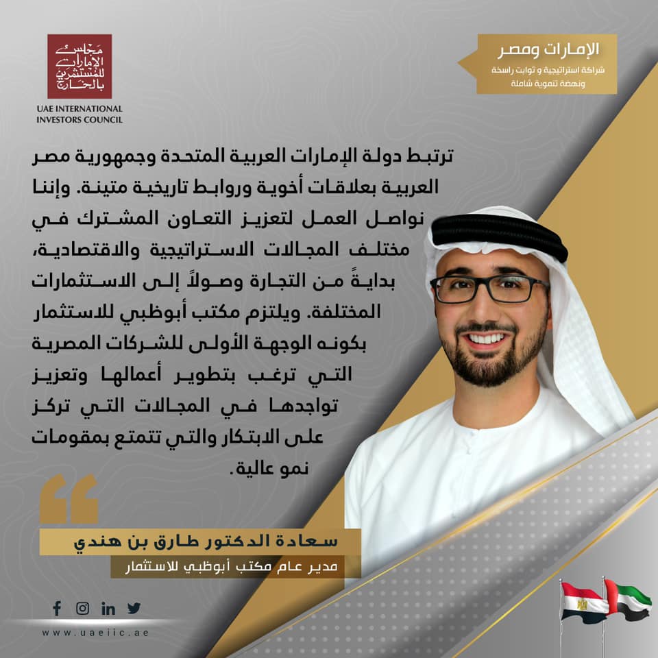 ترتبط دولة الإمارات العربية المتحدة وجمهورية مصر العربية بعلاقات أخوية وروابط تاريخية متينة. وإننا نواصل العمل لتعزيز التعاون المشترك في مختلف المجالات الاستراتيجية والاقتصادية، بدايةً من التجارة وصولاً إلى الاستثمارات المختلفة. ويلتزم مكتب أبوظبي للاستثمار بكونه الوجهة الأولى للشركات المصرية التي ترغب بتطوير أعمالها وتعزيز تواجدها في المجالات التي تركز على الابتكار والتي تتمتع بمقومات نمو عالية.