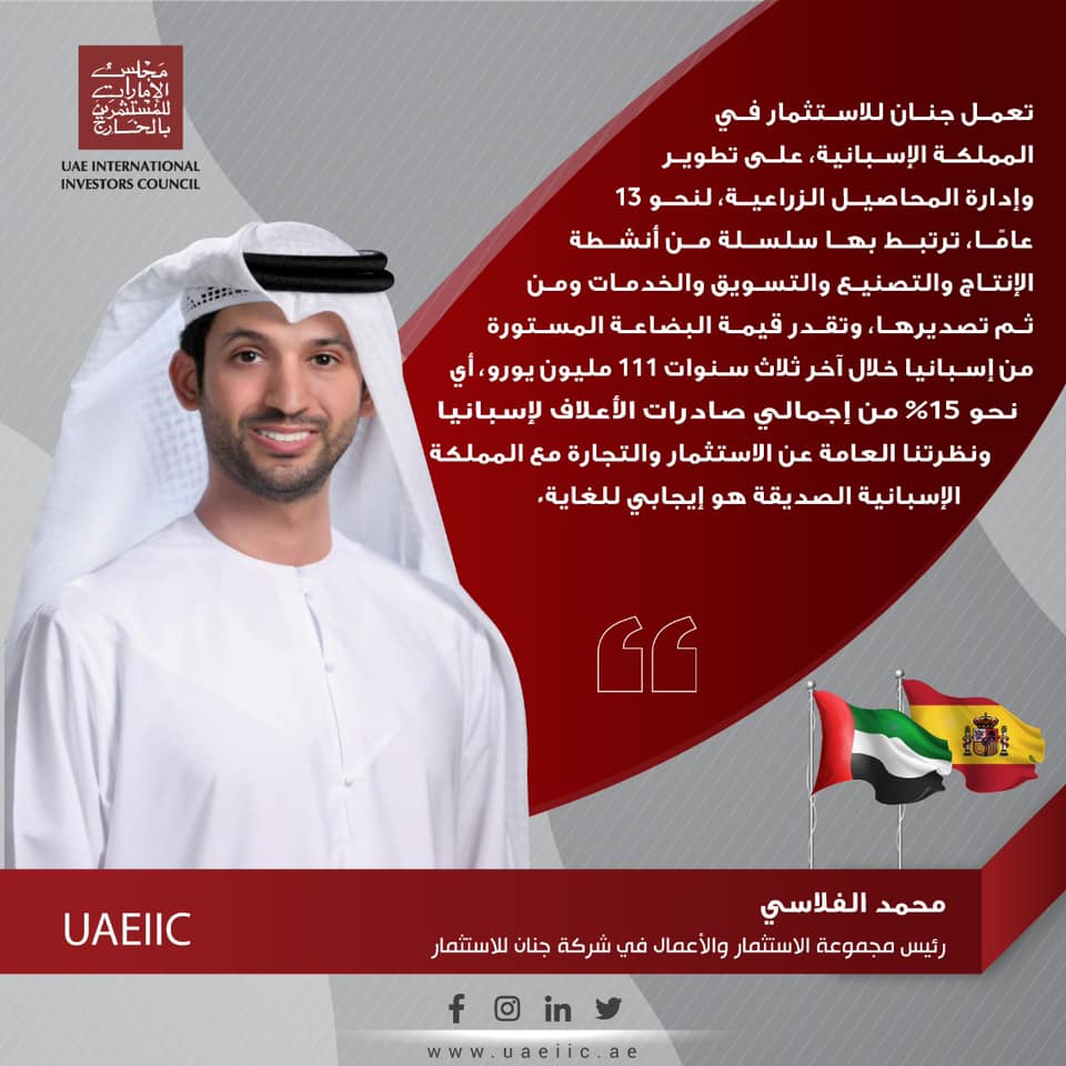 تعمل جنان للاستثمار في المملكة الإسبانية، على تطوير وإدارة المحاصيل الزراعية، لنحو 13 عامًا، ترتبط بها سلسلة من أنشطة الإنتاج والتصنيع والتسويق والخدمات ومن ثم تصديرها، وتقدر قيمة البضاعة المستورة من إسبانيا خلال آخر ثلاث سنوات 111 مليون يورو، أي نحو 15% من إجمالي صادرات الأعلاف لإسبانيا، ونظرتنا العامة عن الاستثمار والتجارة مع المملكة الإسبانية الصديقة هو إيجابي