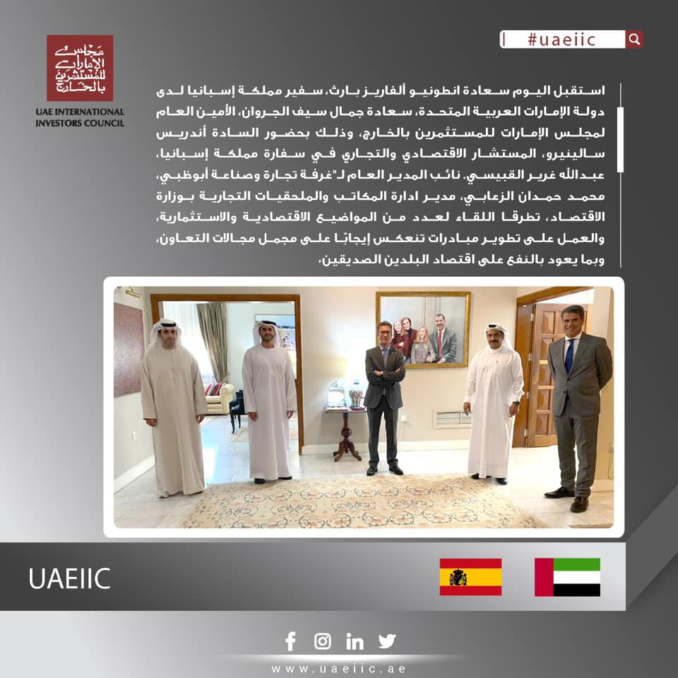 استقبل اليوم سعادة انطونيو ألفاريز بارث، سفير مملكة إسبانيا لدى دولة الإمارات العربية المتحدة، سعادة جمال سيف الجروان، الأمين العام لمجلس الإمارات للمستثمرين بالخارج، وذلك بحضور السادة أندريس سالينيرو، المستشار الاقتصادي والتجاري في سفارة مملكة إسبانيا، عبدالله غرير القبيسي. نائب المدير العام لـ"غرفة تجارة وصناعة أبوظبي، محمد حمدان الزعابي، مدير ادارة المكاتب والملحقيات التجارية بوزارة الاقتصاد، تطرقا اللقاء لعدد من المواضيع الاقتصادية والاستثمارية، والعمل على تطوير مبادرات تنعكس إيجابًا على مجمل مجالات التعاون، وبما يعود بالنفع على اقتصاد البلدين الصديقين.
