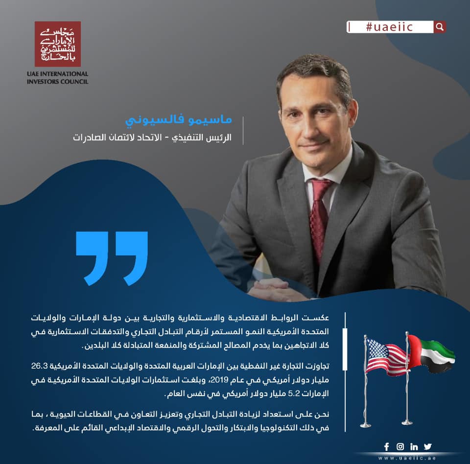 عكست الروابط الاقتصادية والاستثمارية والتجارية بين دولة الإمارات والولايات المتحدة الأمريكية النمو المستمر لأرقام التبادل التجاري والتدفقات الاستثمارية في كلا الاتجاهين بما يخدم المصالح المشتركة والمنفعة المتبادلة كلا البلدين.