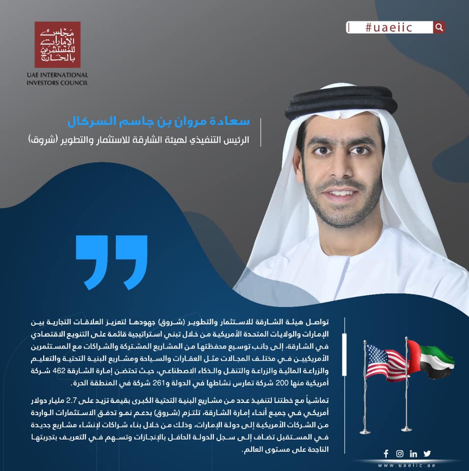 تواصل هيئة الشارقة للاستثمار والتطوير (شروق) جهودها لتعزيز العلاقات التجارية بين الإمارات والولايات المتحدة الأمريكية من خلال تبني استراتيجية قائمة على التنويع الاقتصادي في الشارقة، إلى جانب توسيع محفظتها من المشاريع المشتركة والشراكات مع المستثمرين الأمريكيين في مختلف المجالات مثل العقارات والسياحة ومشاريع البنية التحتية والتعليم والزراعة المائية والزراعة والتنقل والذكاء الاصطناعي، حيث تحتضن إمارة الشارقة 462 شركة أمريكية منها 200 شركة تمارس نشاطها في الدولة و261 شركة في المنطقة الحرة.