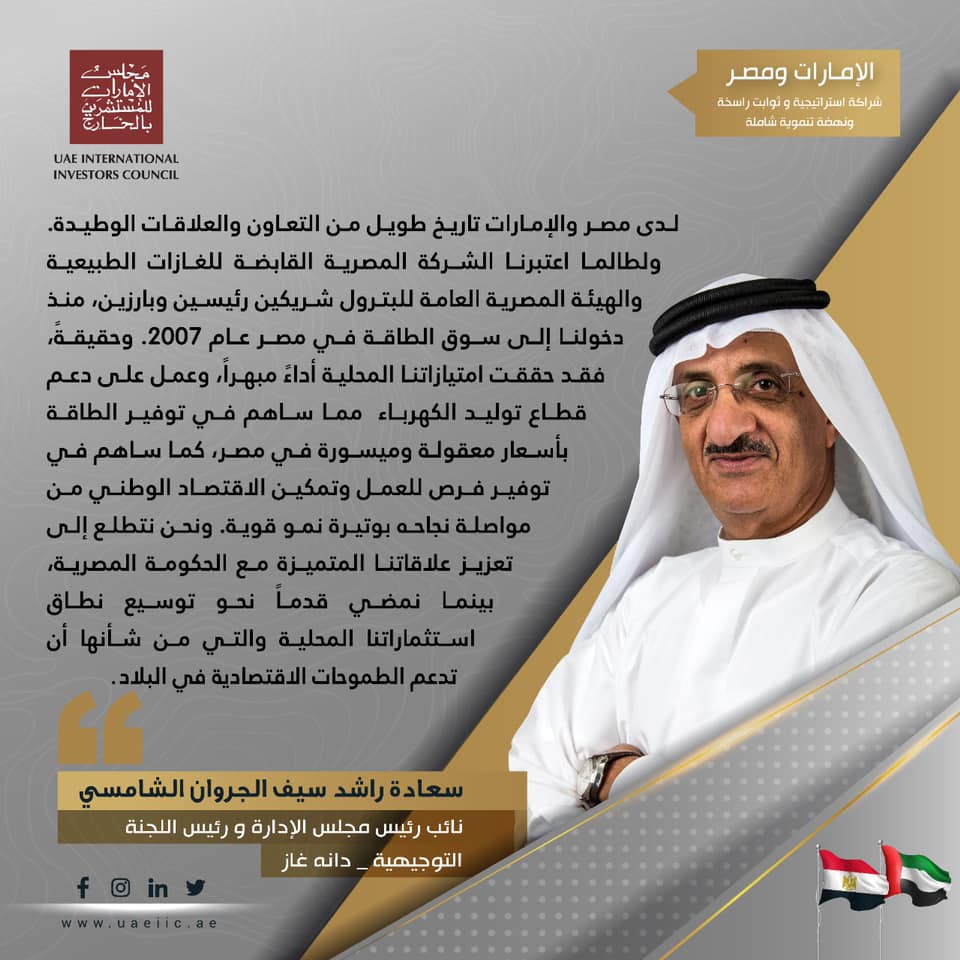 لدى مصر والإمارات تاريخ طويل من التعاون والعلاقات الوطيدة. ولطالما اعتبرنا الشركة المصرية القابضة للغازات الطبيعية والهيئة المصرية العامة للبترول شريكين رئيسين وبارزين، منذ دخولنا إلى سوق الطاقة في مصر عام 2007. وحقيقةً، فقد حققت امتيازاتنا المحلية أداءً مبهراً، وعمل على دعم قطاع توليد الكهرباء مما ساهم في توفير الطاقة بأسعار معقولة وميسورة في مصر، كما ساهم في توفير فرص للعمل وتمكين الاقتصاد الوطني من مواصلة نجاحه بوتيرة نمو قوية. ونحن نتطلع إلى تعزيز علاقاتنا المتميزة مع الحكومة المصرية، بينما نمضي قدماً نحو توسيع نطاق استثماراتنا المحلية والتي من شأنها أن تدعم الطموحات الاقتصادية في البلاد.