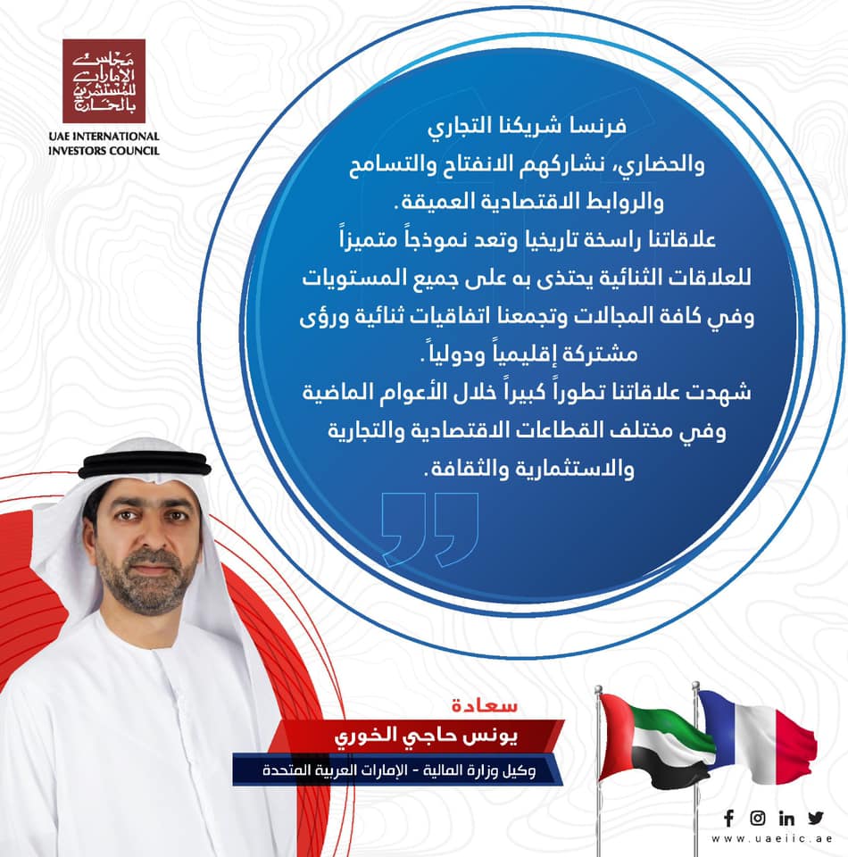 فرنسا شريكنا التجاري والحضاري، نشاركهم الانفتاح والتسامح والروابط الاقتصادية العميقة. علاقاتنا راسخة تاريخيا وتعد نموذجاً متميزاً للعلاقات الثنائية يحتذى به على جميع المستويات وفي كافة المجالات وتجمعنا اتفاقيات ثنائية ورؤى مشتركة إقليمياً ودولياً. شهدت علاقاتنا تطوراً كبيراً خلال الأعوام الماضية وفي مختلف القطاعات الاقتصادية والتجارية والاستثمارية والثقافة.