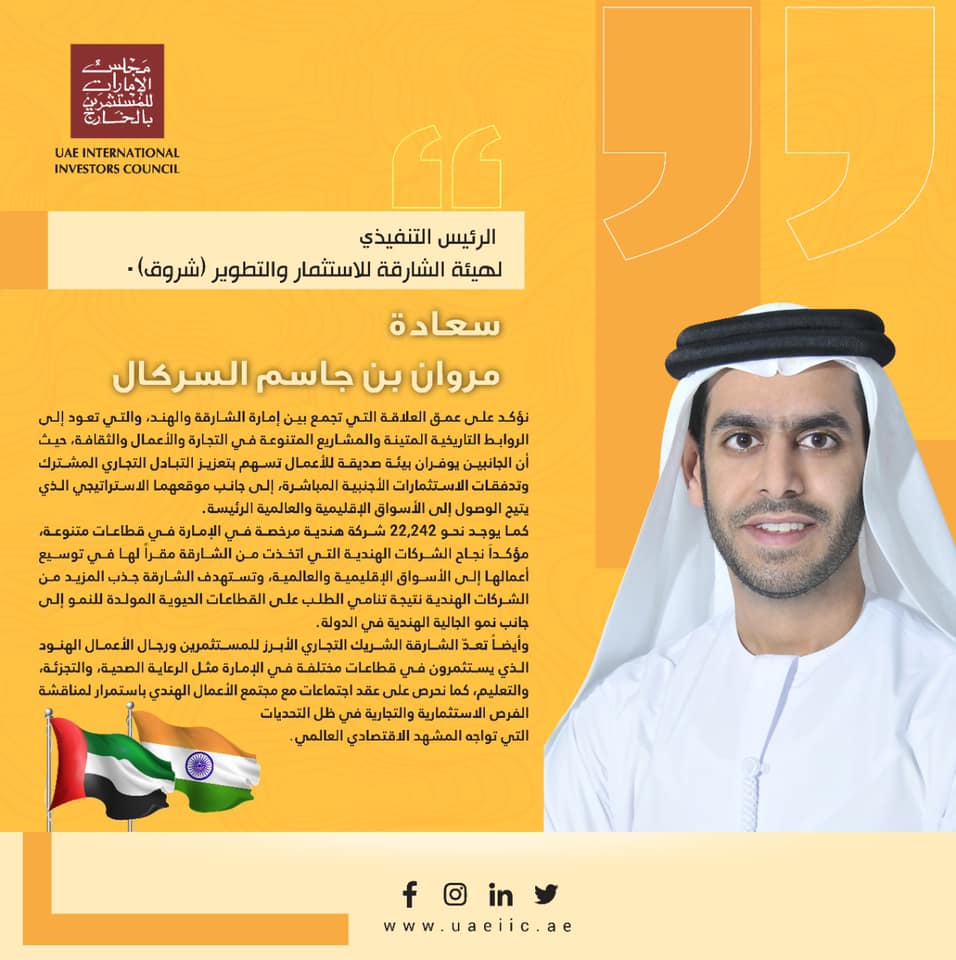 كما يوجد نحو 22,242 شركة هندية مرخصة في الإمارة في قطاعات متنوعة، مؤكداَ نجاح الشركات الهندية التي اتخذت من الشارقة مقراً لها في توسيع أعمالها إلى الأسواق الإقليمية والعالمية، وتستهدف الشارقة جذب المزيد من الشركات الهندية نتيجة تنامي الطلب على القطاعات الحيوية المولدة للنمو إلى جانب نمو الجالية الهندية في الدولة.