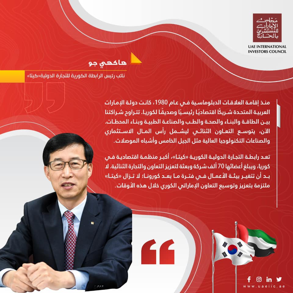 تعد رابطة التجارة الدولية الكورية «كيتا»، أكبر منظمة اقتصادية في كوريا، ويبلغ أعضائها 70 ألف شركة وبعثة لتعزيز التعاون والتجارة الثنائية. لا بد أن تتغير بيئة الأعمال في فترة ما بعد كورونا؛ لا تزال «كيتا» ملتزمة بتعزيز وتوسيع التعاون الإماراتي الكوري خلال هذه الأوقات.