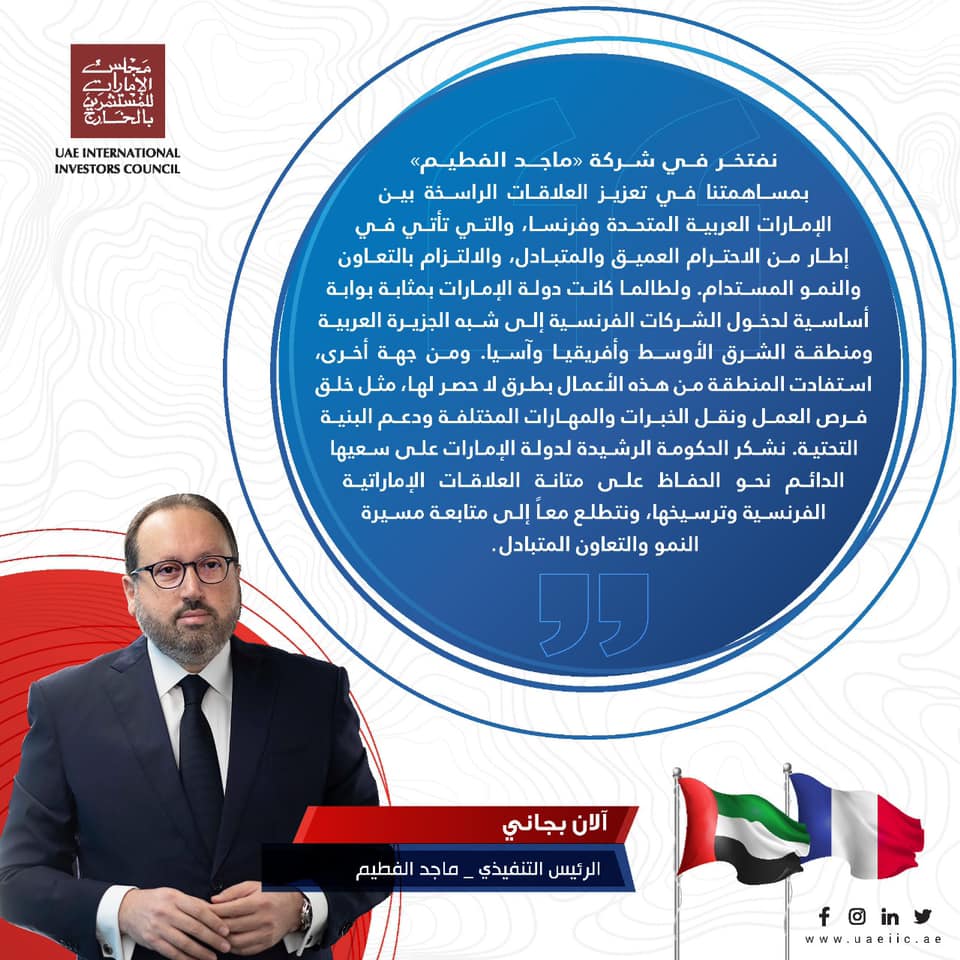نفتخر في شركة «ماجد الفطيم» بمساهمتنا في تعزيز العلاقات الراسخة بين الإمارات العربية المتحدة وفرنسا، والتي تأتي في إطار من الاحترام العميق والمتبادل، والالتزام بالتعاون والنمو المستدام. ولطالما كانت دولة الإمارات بمثابة بوابة أساسية لدخول الشركات الفرنسية إلى شبه الجزيرة العربية ومنطقة الشرق الأوسط وأفريقيا وآسيا. ومن جهة أخرى، استفادت المنطقة من هذه الأعمال بطرق لا حصر لها، مثل خلق فرص العمل ونقل الخبرات والمهارات المختلفة ودعم البنية التحتية. نشكر الحكومة الرشيدة لدولة الإمارات على سعيها الدائم نحو الحفاظ على متانة العلاقات الإماراتية الفرنسية وترسيخها، ونتطلع معاً إلى متابعة مسيرة النمو والتعاون المتبادل.