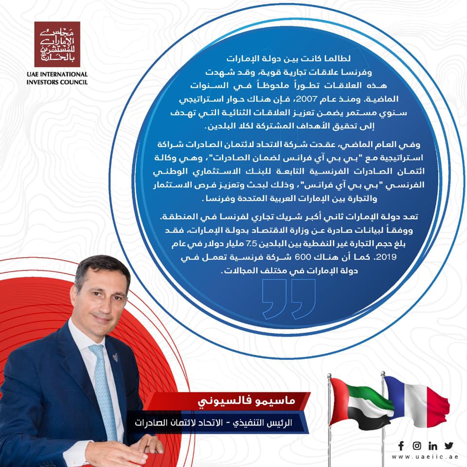 وفي العام الماضي، عقدت شركة الاتحاد لائتمان الصادرات شراكة استراتيجية مع "بي بي آي فرانس لضمان الصادرات"، وهي وكالة ائتمان الصادرات الفرنسية التابعة للبنك الاستثماري الوطني الفرنسي "بي بي آي فرانس"، وذلك لبحث وتعزيز فرص الاستثمار والتجارة بين الإمارات العربية المتحدة وفرنسا.