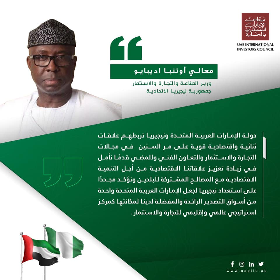 دولة الإمارات العربية المتحدة ونيجيريا تربطهم علاقات ثنائية واقتصادية قوية على مر السنين في مجالات التجارة والاستثمار والتعاون الفني وللمضي قدمًا نأمل في زيادة تعزيز علاقاتنا الاقتصادية من أجل التنمية الاقتصادية مع المصالح المشتركة للبلدين ونؤكد مجددًا على استعداد نيجيريا لجعل الإمارات العربية المتحدة واحدة من أسواق التصدير الرائدة والمفضلة لدينا لمكانتها كمركز استراتيجي عالمي وإقليمي للتجارة والاستثمار