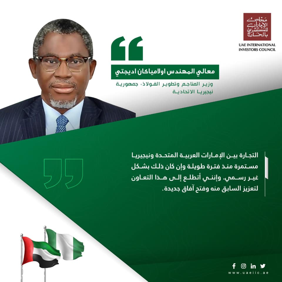 التجارة بين الإمارات العربية المتحدة ونيجيريا مستمرة منذ فترة طويلة وإن كان ذلك بشكل غير رسمي . وإنني أتطلع إلى هذا التعاون لتعزيز السابق منه وفتح آفاق جديدة.