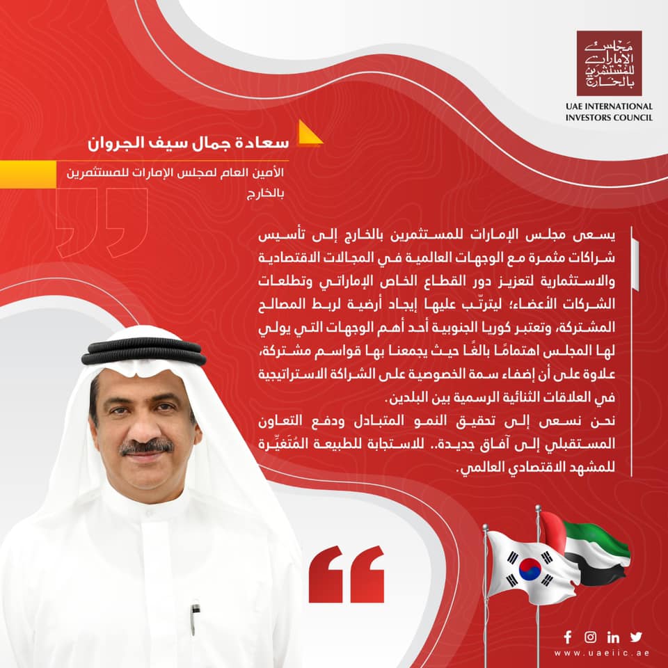 يسعى مجلس الإمارات للمستثمرين بالخارج إلى تأسيس شراكات مثمرة مع الوجهات العالمية في المجالات الاقتصادية والاستثمارية لتعزيز دور القطاع الخاص الإماراتي وتطلعات الشركات الأعضاء؛ ليترتّب عليها إيجاد أرضية لربط المصالح المشتركة، وتعتبر كوريا الجنوبية أحد أهم الوجهات التي يولي لها المجلس اهتمامًا بالغًا حيث يجمعنا بها قواسم مشتركة، علاوة على أن إضفاء سمة الخصوصية على الشراكة الاستراتيجية في العلاقات الثنائية الرسمية بين البلدين.