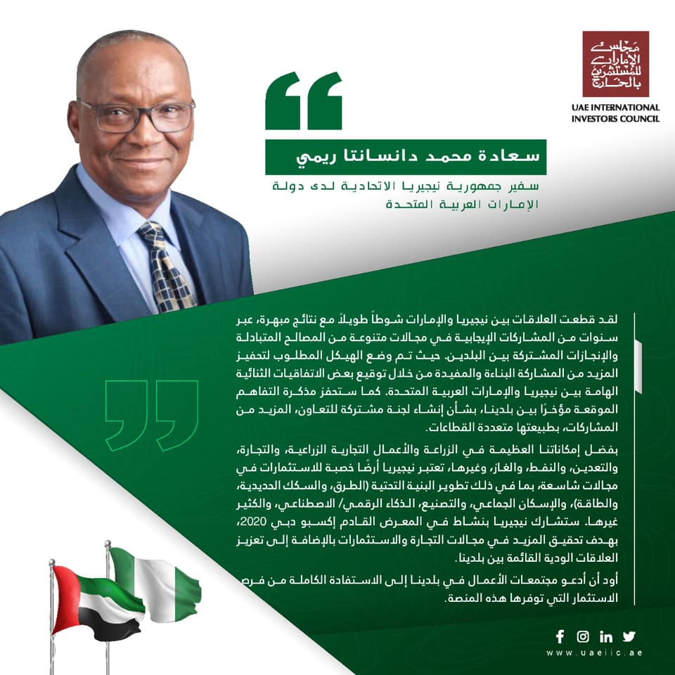 بفضل إمكاناتنا العظيمة في الزراعة والأعمال التجارية الزراعية، والتجارة، والتعدين، والنفط، والغاز، وغيرها، تعتبر نيجيريا أرضًا خصبة للاستثمارات في مجالات شاسعة، بما في ذلك تطوير البنية التحتية (النقل والمواصلات، والسكك الحديدية، والطاقة)، والإسكان الجماعي، والتصنيع، الذكاء الرقمي/ الاصطناعي، والكثير غيرها. ستشارك نيجيريا بنشاط في المعرض القادم إكسبو دبي 2020، بهدف تحقيق المزيد في مجالات التجارة والاستثمارات بالإضافة إلى تعزيز العلاقات الودية القائمة بين بلدينا.