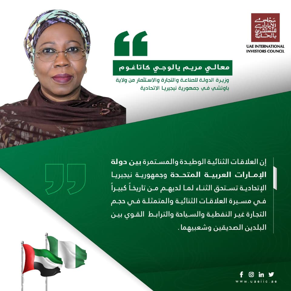 إن العلاقات الثنائية الوطيدة والمستمرة بين دولة الإمارات العربية المتحدة وجمهورية نيجيريا الإتحادية تستحق الثناء لما لديهم من تاريخاً كبيراً في مسيرة العلاقات الثنائية والمتمثلة في حجم التجارة غير النفطية والسياحة والترابط القوي بين البلدين الصديقين وشعبيهما.