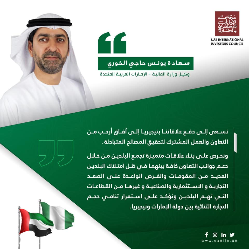 ونحرص على بناء علاقات متميزة تجمع البلدين من خلال دعم جوانب التعاون كافة بينهما في ظل امتلاك البلدين العديد من المقومات والفرص الواعدة على الصعد التجارية و الاستثمارية والصناعية و غيرها من القطاعات التي تهم البلدين ونؤكد على استمرار تنامي حجم التجارة الثنائية بين دولة الإمارات ونيجيريا.