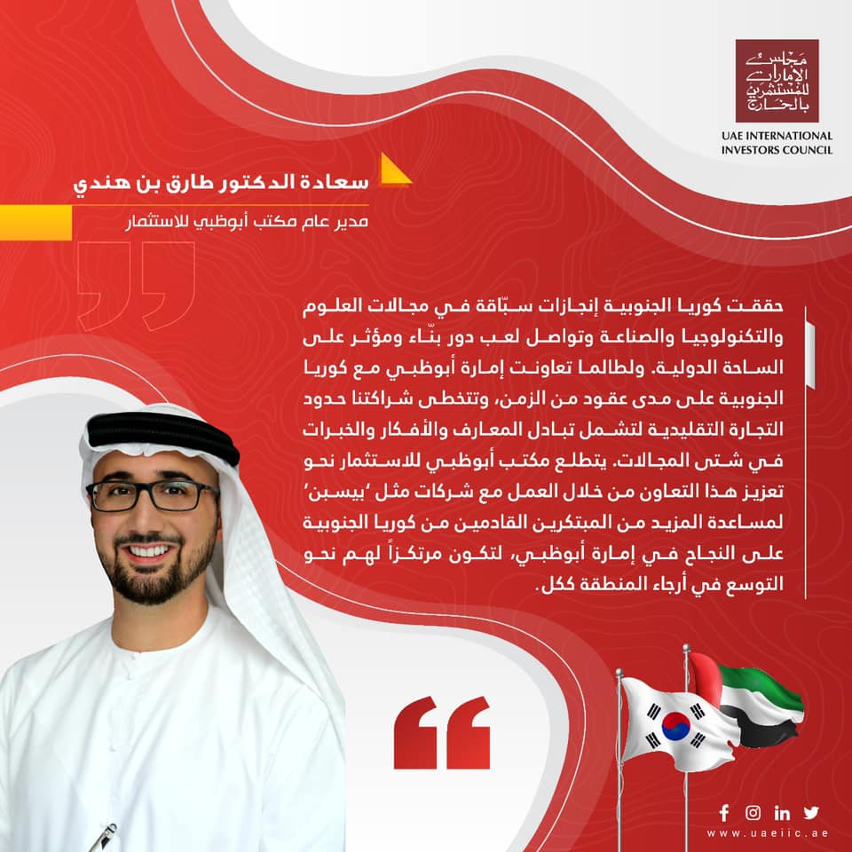 حققت كوريا الجنوبية إنجازات سبّاقة في مجالات العلوم والتكنولوجيا والصناعة وتواصل لعب دور بنّاء ومؤثر على الساحة الدولية. ولطالما تعاونت إمارة أبوظبي مع كوريا الجنوبية على مدى عقود من الزمن، وتتخطى شراكتنا حدود التجارة التقليدية لتشمل تبادل المعارف والأفكار والخبرات في شتى المجالات. يتطلع مكتب أبوظبي للاستثمار نحو تعزيز هذا التعاون من خلال العمل مع شركات مثل ’بيسبن‘ لمساعدة المزيد من المبتكرين القادمين من كوريا الجنوبية على النجاح في إمارة أبوظبي، لتكون مرتكزاً لهم نحو التوسع في أرجاء المنطقة ككل.
