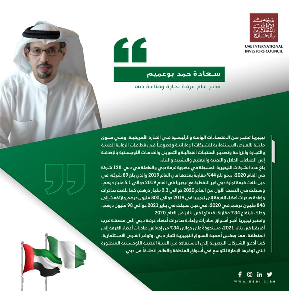 وتعتبر نيجيريا أكبر أسواق صادرات وإعادة صادرات أعضاء غرفة دبي إلى منطقة غرب أفريقيا في يناير 2021، مستحوذةً على حوالي 34% من إجمالي صادرات أعضاء الغرفة إلى المنطقة، مما يعكس أهمية السوق النيجيرية لتجار دبي، وتوفر الفرص الاستثمارية، كما أدعو الشركات النيجيرية إلى الاستفادة من البنية التحتية اللوجستية المتطورة التي توفرها الإمارة للتوسع في أسواق المنطقة والعالم انطلاقاً من دبي.
