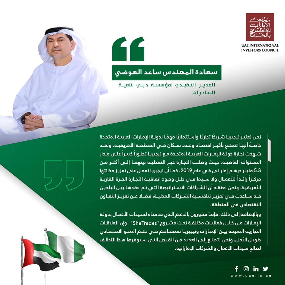 نحن نعتبر نيجيريا شريكًا تجاريًا واستثماريًا مهمًا لدولة الإمارات العربية المتحدة خاصةً أنها تتمتع بأكبر اقتصاد وعدد سكان في المنطقة الأفريقية. ولقد شهدت تجارة دولة الإمارات العربية المتحدة مع نيجيريا تطوراً كبيراً على مدار السنوات الماضية، حيث وصلت التجارة غير النفطية بينهما إلى أكثر من 5.3 مليار درهم إماراتي في عام 2019. كما أن نيجيريا تعمل على تعزيز مكانتها مركزاً رائداً للأعمال ولا سيما في ظل وجود اتفاقية التجارة الحرة القارية الأفريقية. ونحن نعتقد أن الشراكات الاستراتيجية التي تم عقدها بين البلدين قد ساعدت في تعزيز تنافسية الشركات المحلية، فضلا عن تعزيز التعاون الاقتصادي في المنطقة.