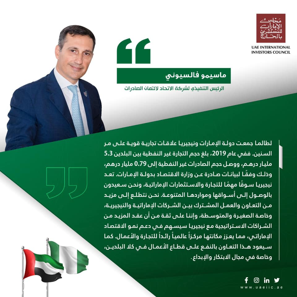 لطالما جمعت دولة الإمارات ونيجيريا علاقات تجارية قوية على مر السنين. ففي عام 2019، بلغ حجم التجارة غير النفطية بين البلدين 5.3 مليار درهم، ووصل حجم الصادرات غير النفطية إلى 0.79 مليار درهم، وذلك وفقًا لبيانات صادرة عن وزارة الاقتصاد بدولة الإمارات. تعد نيجيريا سوقًا مهمًا للتجارة والاستثمارات الإماراتية، ونحن سعيدون بالوصول إلى أسواقها ومواردها المتنوعة. نحن نتطلع إلى مزيد من التعاون والعمل المشترك بين الشركات الإماراتية والنيجيرية، وخاصة الصغيرة والمتوسطة، وإننا على ثقة من أن عقد المزيد من الشراكات الاستراتيجية مع نيجيريا سيسهم في دعم نمو الاقتصاد الإماراتي، مما يعزز مكانتها مركزاً عالمياً رائداً للتجارة والأعمال. كما سيعود هذا التعاون بالنفع على قطاع الأعمال في كلا البلدين، وخاصة في مجال الابتكار والإبداع.