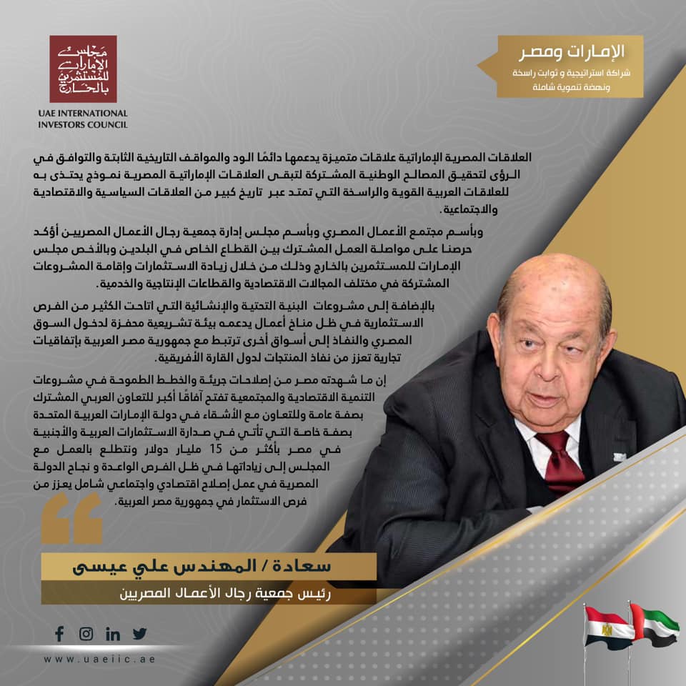 الإمـارات ومصـر... شراكة استراتيجية و ثوابت راسخة ونهضة تنموية شاملة سعادة / المهندس علي عيسى رئيس جمعية رجال الأعمال المصريين العلاقات المصرية الإماراتية علاقات متميزة يدعمها دائمًا الود والمواقف التاريخية الثابتة والتوافق في الرؤى لتحقيق المصالح ا