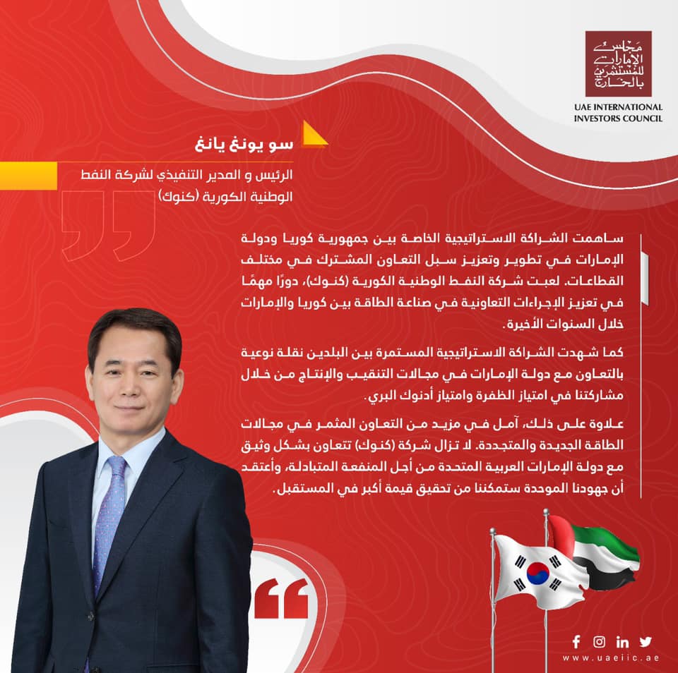 علاوة على ذلك، آمل في مزيد من التعاون المثمر في مجالات الطاقة الجديدة والمتجددة. لا تزال شركة (كنوك) تتعاون بشكل وثيق مع دولة الإمارات العربية المتحدة من أجل المنفعة المتبادلة، وأعتقد أن جهودنا الموحدة ستمكننا من تحقيق قيمة أكبر في المستقبل.