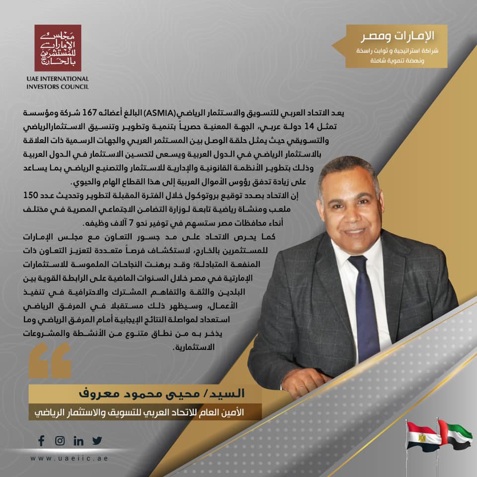 كما يحرص الاتحاد على مد جسور التعاون مع مجلس الإمارات للمستثمرين بالخارج، لاستكشاف فرصاً متعددة لتعزيز التعاون ذات المنفعة المتبادلة؛ وقد برهنت النجاحات الملموسة للاستثمارات الإمارتية في مصر خلال السنوات الماضية على الرابطة القوية بين البلدين والثقة والتفاهم المشترك والاحترافية في تنفيذ الأعمال، وسيظهر ذلك مستقبلا في المرفق الرياضي استعداد لمواصلة النتائج الإيجابية أمام المرفق الرياضي وما يذخر به من نطاق متنوع من الأنشطة والمشروعات الاستثمارية.