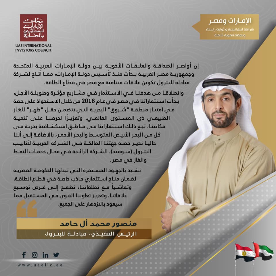 إن أواصر الصداقة والعلاقات الأخوية بين دولة الإمارات العربية المتحدة وجمهورية مصر العربية بدأت منذ تأسيس دولة الإمارات، مما أتاح لشركة مبادلة للبترول تكوين علاقات متنامية مع مصر في قطاع الطاقة.